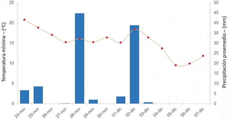 Cabe mencionar que luego de las importantes precipitaciones registradas entre el sábado 28 de noviembre y el miércoles 2 de diciembre hubo un marcado descenso de las temperaturas (Figura 3). La combinación de fuertes lluvias y bajas temperaturas ocasionó la perdida de algunas hectáreas por encostramiento y “damping off” (muerte súbita), las cuales debieron ser resembradas.
