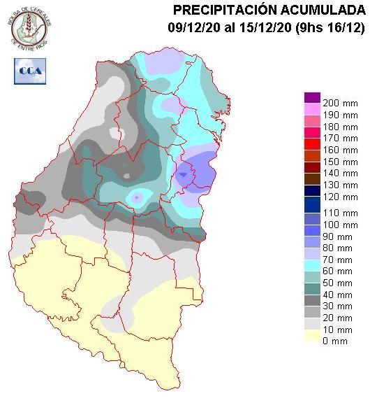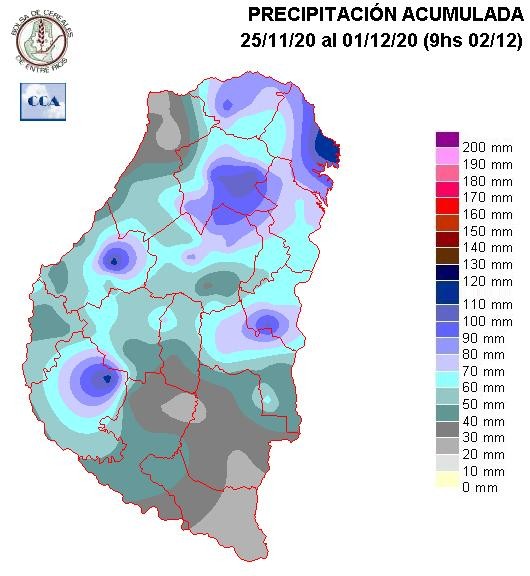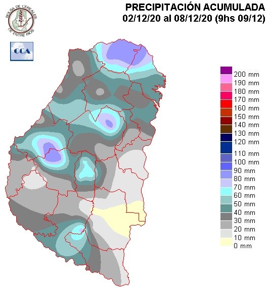En esta ocasión se ha configurado un máximo importante sobre el sur Concordia y las vecindades de San Salvador. También se observan otras áreas reducidas con precipitaciones por encima de los setenta milímetros, al tiempo que los departamentos del sur quedaron mal provistos, consolidándose un mínimo que tiene como epicentro en lo que va de Diciembre, al departamento Gualeguaychú y sur de Uruguay.