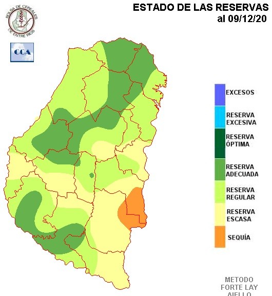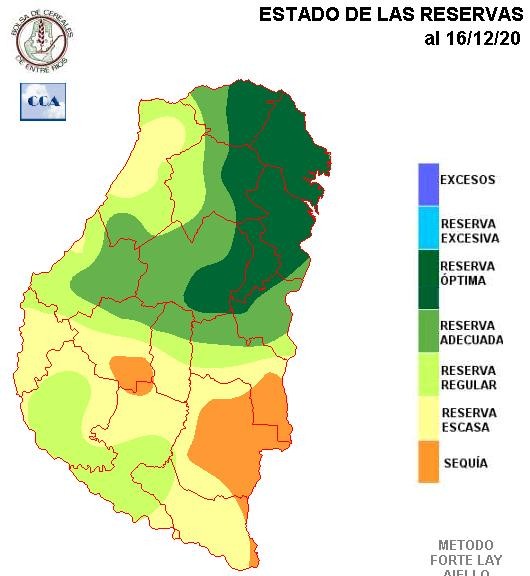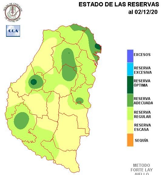El balance hídrico, evidentemente responde favorablemente y en forma bien diferenciada a la muy buena oferta de agua que se presentó sobre el noreste provincial. A medida que nos desplazamos hacia el sur y también gran parte del oeste, el panorama de reservas se vuelve mucho más heterogéneo. Se han configurado zonas de sequía, que a esta altura son muy riesgosas para los cultivos de verano, en áreas de Gualeguaychú, Uruguay y en menor medida Nogoyá. El riesgo reside en que estas áreas no tienen buen pronóstico de volumen de lluvia en el corto plazo. Es decir entre viernes y sábado, se podrían concretar lluvias en la zona, pero por debajo de los requerimientos que presentan los cultivos, sobre todo el maíz que pudo sembrarse temprano.
