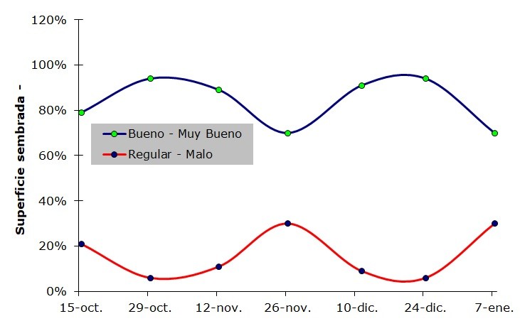 La siembra de maíz de segunda y tardío continuó durante el mes de diciembre. El grado de avance se ubica en el 95 % del área estimada, y lo que resta sembrar depende de la ocurrencia de precipitaciones, ya que no hay humedad en la cama de siembra.