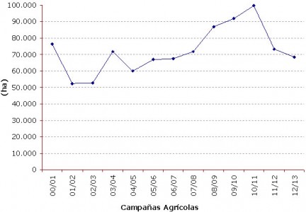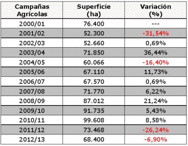 Por segundo año consecutivo el área cultivada con el cereal ha sufrido una reducción de su superficie posicionándose en 68.400 ha, lo cual representa una caída con respecto al ciclo agrícola anterior del 6,9% y equivale a una merma de 5.068 ha.