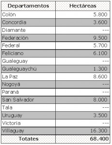 Se destacan los distritos Lucas al Sur (Dpto. Villaguay) y Tacuaras (Dpto. La Paz) con el rango máximo, superando las 8.000 ha y por debajo de las 10.000 ha.