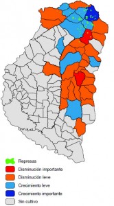 Por otra parte, en color verde se han localizado geográficamente las represas, lo cual destaca muy claramente como los distritos en los cuales existe mayor participación de esta fuente de riego fueron casi exclusivamente los únicos que pudieron incrementar el número de hectáreas. Siendo el distrito Tatutí (Dpto. Federación) donde se constató el máximo crecimiento.