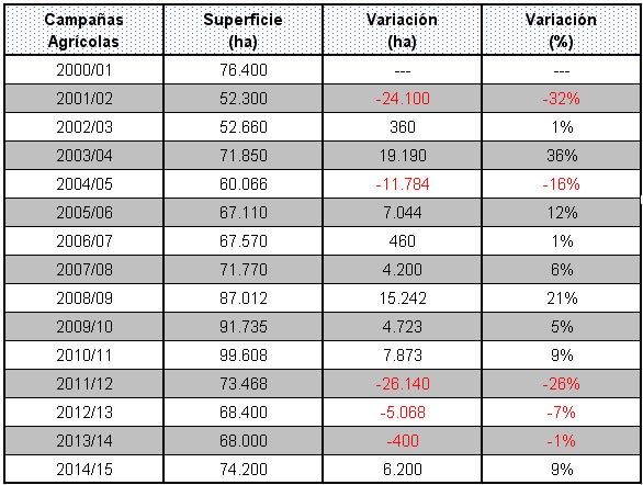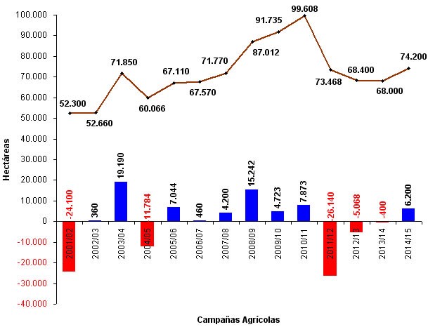 Es importante destacar que desde el año 2010/11 (campaña en la cual el área implantada logró su máxima expresión en los últimos 14 años con 99.608 ha), no se generaba un crecimiento en la superficie dedicada al cereal.