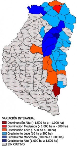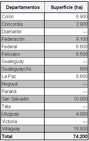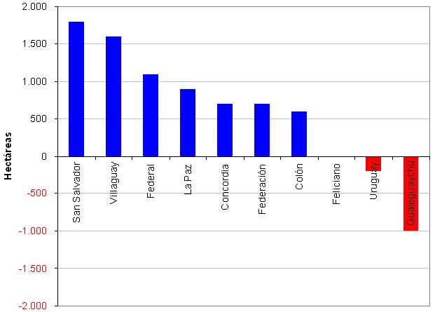 Los departamentos que incrementaron la superficie fueron: San Salvador, Villaguay, Federal, La Paz, Concordia, Federación y Colón, con variaciones que oscilaron entre 600 ha y 1.800 ha.