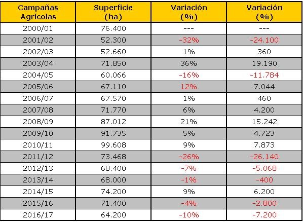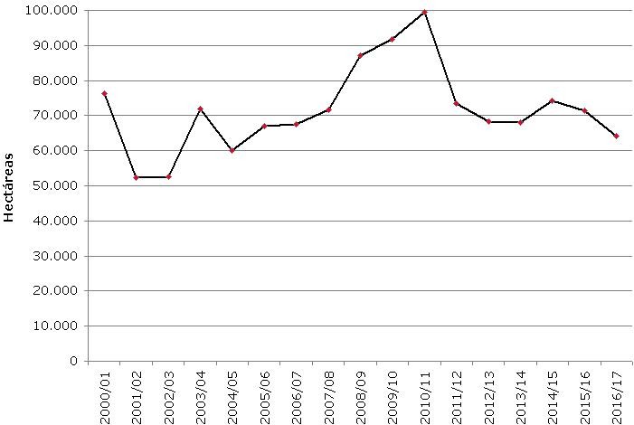 En los últimos 17 años, se produjo un máximo de 99.608 ha en la campaña 2010/11 y posteriormente se observó una importante reducción con una estabilización alrededor de 71.000 ha entre los ciclos 2011/12 y 2015/16.
