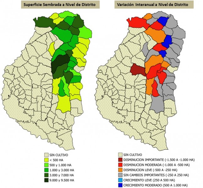 Si se analiza la variación interanual se observa que en 25 distritos han experimentado una disminución del área implantada y tan solo en 10 se detectó una expansión de la superficie (Mapa N° 2).