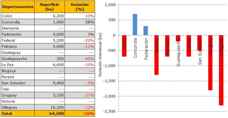 Se observa en tan solo dos departamentos un crecimiento en el área: Concordia (700 ha) y Federación (300 ha). En el resto del territorio hay mermas, las más significativas corresponden a: Villaguay (-2.300 ha), Uruguay (-1.800 ha) y Federal (-1.300 ha).