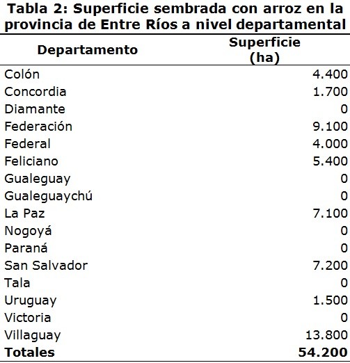 Los datos estadísticos sobre la superficie implantada con arroz a nivel departamental se presentan en la Tabla 2.