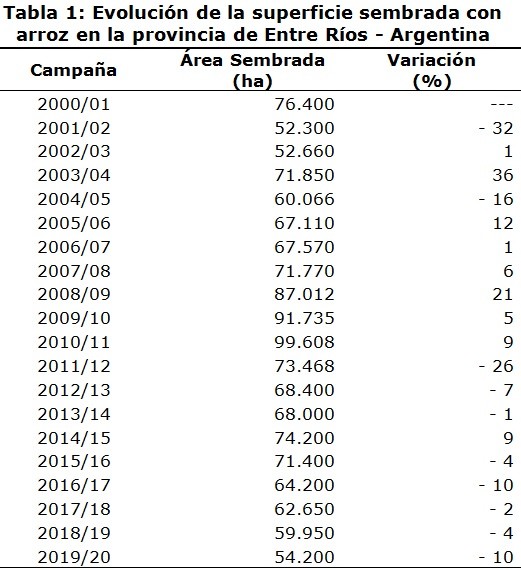 Los datos estadísticos sobre la evolución del área implantada con arroz en Entre Ríos se presentan en la Tabla 1.