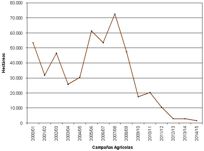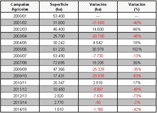 El área cultivada con la oleaginosa se ubicó en 1.610 ha, este hecho reportó una caída del 42%, lo cual marcó un retroceso de 1.160 ha en relación al ciclo anterior.