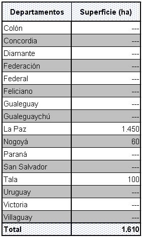 En los distritos Algarrobitos (Dpto. Nogoyá), Pueblo 2do y Sauce Norte (Dto. Tala) las chacras cultivadas son inferior a 100 ha.