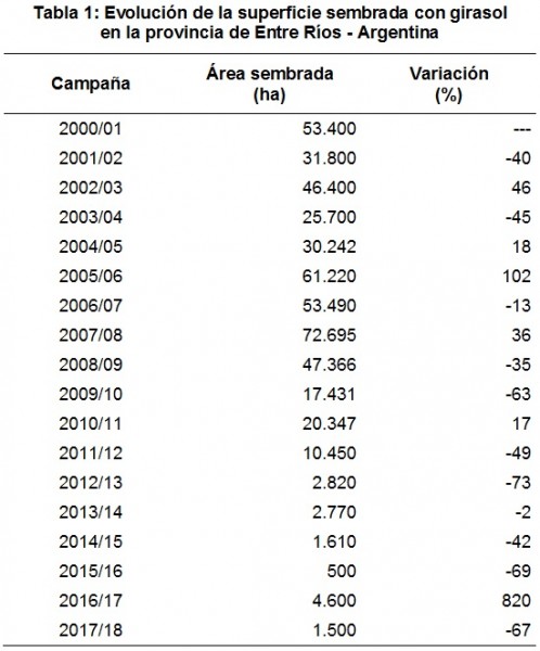 Los datos estadísticos sobre la evolución del área implantada con girasol en Entre Ríos se presentan en la Tabla 1.