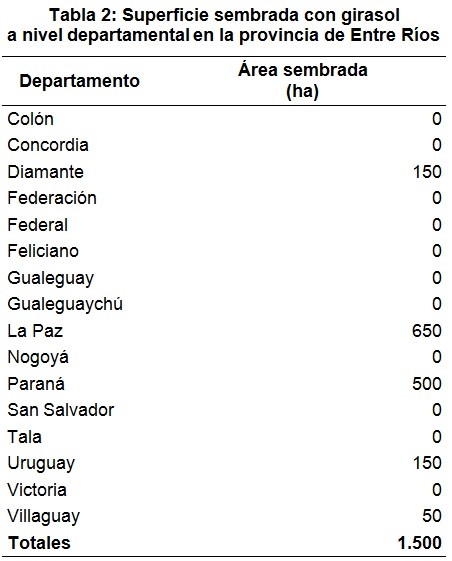 Se detectó la siembra de girasol en tan solo 5 de los 17 departamentos que conforman la provincia de Entre Ríos.