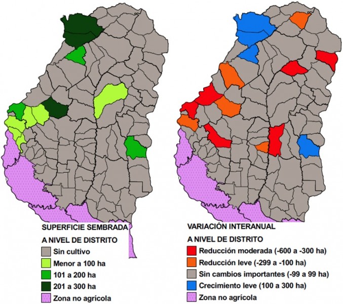 Los distritos con mayor crecimiento interanual en la superficie sembrada fueron: Tacuaras, Estacas y Yeso (Dpto. La Paz) y Molinos (Dpto. Uruguay).