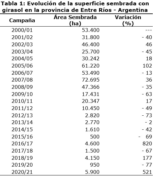 Los datos estadísticos sobre la evolución del área implantada con girasol en Entre Ríos se presentan en la Tabla 1.