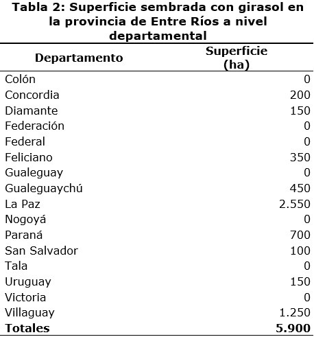 Los datos estadísticos sobre la superficie implantada con girasol a nivel departamental se presentan en la Tabla 2