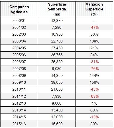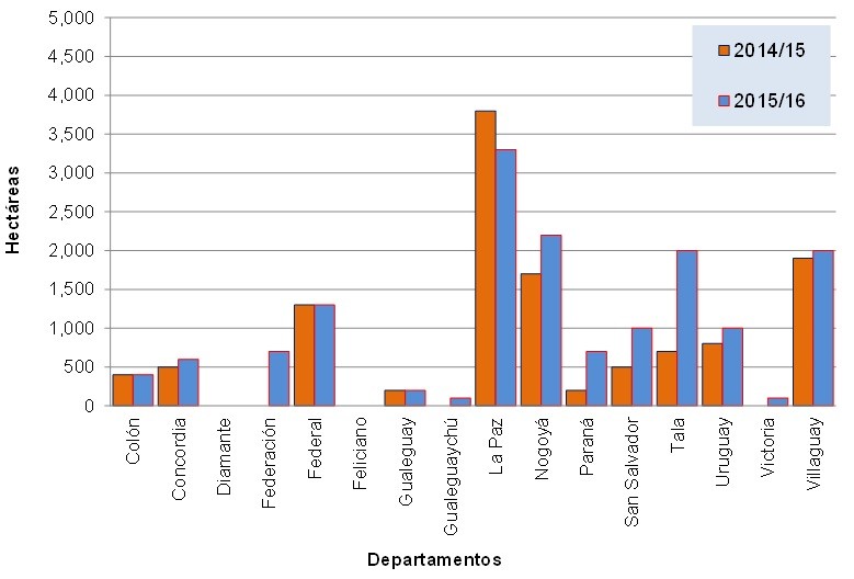El departamento La Paz se destaca por ser el de mayor superficie implantada (3.300 ha) y además por ser el único que experimentó una caída en el área de 500 ha en comparación con el ciclo anterior.