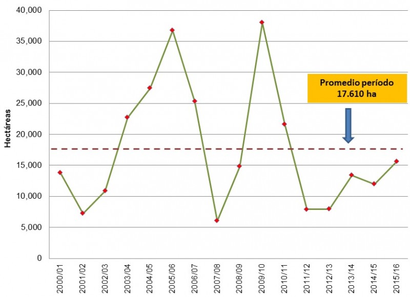 Por otra parte, el máximo crecimiento se detectó en el departamento Tala pasando de 700 ha a 1.300, ver Gráfico Nro. 2.
