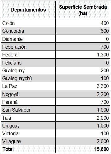 La superficie implantada a nivel departamental se detalla en la Tabla Nro. 2, destacándose los departamentos La Paz, Nogoyá, Villaguay y Tala que en conjunto suman 9.500 ha, lo cual representa el 61% del total implantado.