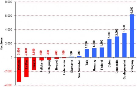 Mientras que en los más cercanos a la costa del río Paraná, que tuvo pulsos de sequía o reservas escasas se detectaron las mayores caídas del área. Se destacan los departamentos Victoria y La Paz con disminuciones de 3.500 ha y 2.800 ha respectivamente.