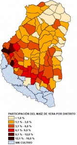 En el Mapa 3 se puede apreciar la participación del cereal en relación al área total de cada distrito.