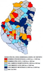 En color gris se clasificaron los distritos donde no se produjeron cambios significativos, es decir donde el área tuvo una disminución inferior a 500 ha o bien crecimientos que no superaron las 500 ha.