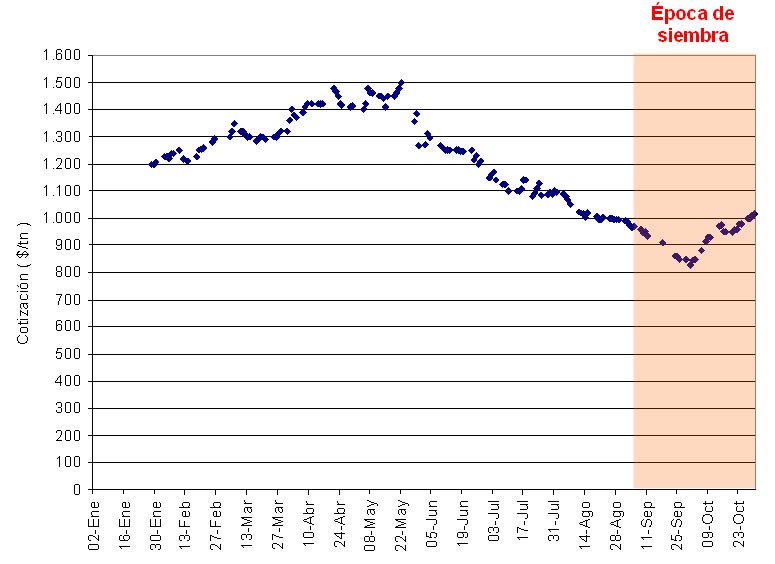 Cabe destacar que hacia fines de mayo el maíz tenía una cotización de 1.500 $/tonelada y hacia mediados de setiembre (mes clave para la siembra) el valor apenas superaba los 800 $/tonelada, es decir que en tan solo 3 meses había perdido alrededor del 45% de su valor.
