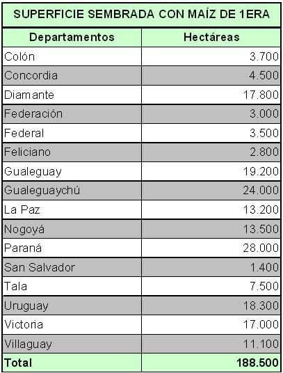 El distrito Pehuajó al Norte (Dpto. Gualeguaychú) se ubica con el mayor número de hectáreas cultivas con maíz de 1era (ver Mapa Nro. 1) contando con una superficie posicionada en el rango de 9.000 ha a 11.000 ha.
