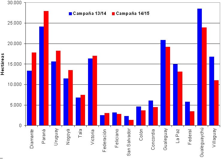 Los departamentos que experimentaron un crecimiento significativo fueron: Diamante, Paraná, Uruguay y Nogoyá; con aumentos que oscilaron entre 2.000 ha y 4.400 ha con respecto al año pasado (ver Gráfico Nro. 2).