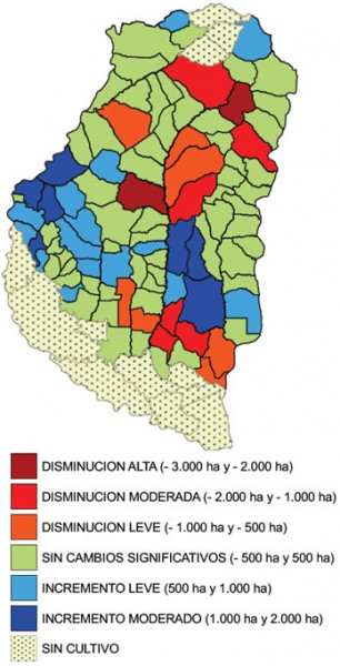Los departamentos: Concordia, Gualeguay, La Paz, Federal, Gualeguaychú y Federal tuvieron una reducción que osciló entre 1.600 ha a 5.700 ha.
