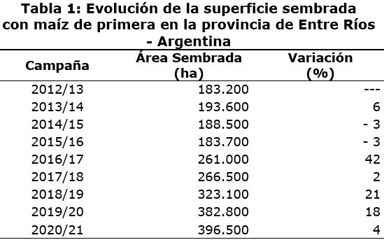 Los datos estadísticos sobre la evolución del área implantada con maíz de primera en Entre Ríos se presentan en la Tabla 1.