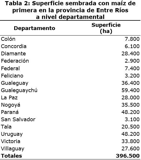 Los datos estadísticos sobre la superficie implantada con maíz de primera a nivel departamental se presentan en la Tabla 2.