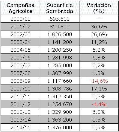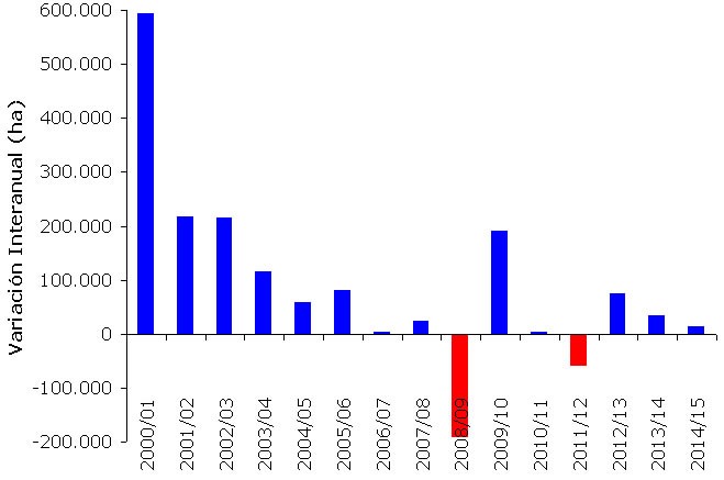 El Gráfico Nro. 1 refleja las variaciones interanuales en el área implantada. Tal como puede apreciarse, desde el ciclo 2000/01 al 2002/03 el cultivo tuvo una expansión que superó las 200.000 ha, este crecimiento fue reduciéndose gradualmente hasta llegar a un mínimo de 3.000 ha en el 2006/07.