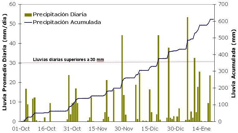 Además del aumento en el monto de las precipitaciones se detectó hacia fines de noviembre un alza en el promedio de la lluvia diaria, registrándose una serie de eventos consecutivos que superaron el valor de 30 mm, hecho que paralizó por varios días las labores de siembra.