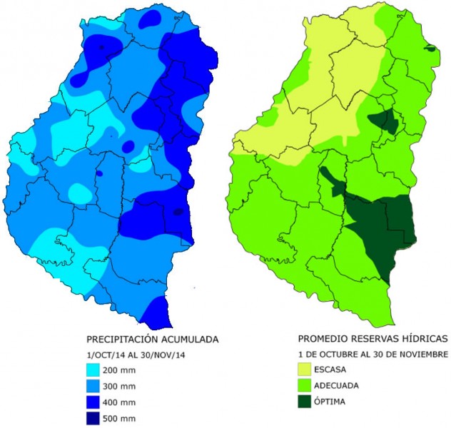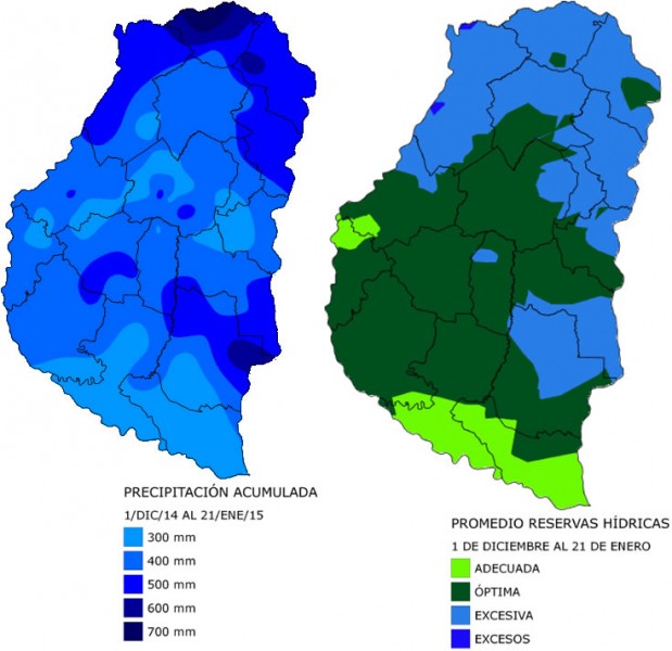 En Entre Ríos desde octubre a enero la lluvia esperada acumulada se ubica alrededor de 450 mm, en la campaña 2014/15 este valor se posicionó alrededor de 630 mm, lo cual representó un incremento del 29% aproximadamente.