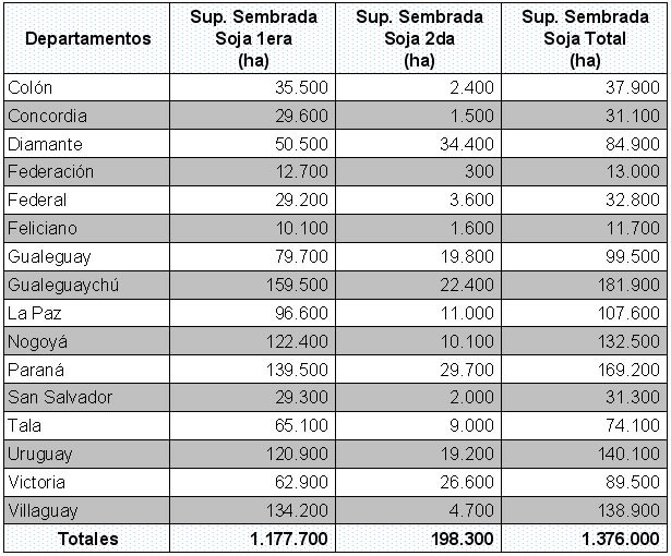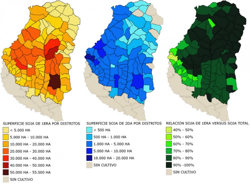 Con respecto a los principales distritos cultivados con soja de 2da se destacan: Palmar e Isletas (Dpto. Diamante), Clé (Dpto. Gualeguay), Pehuajó al Norte (Dpto. Gualeguaychú), Quebracho y Tala (Dpto. Paraná); los cuales abarcaron una superficie cercana a las 50.000 ha, es decir el 25% del área total de soja de 2da.