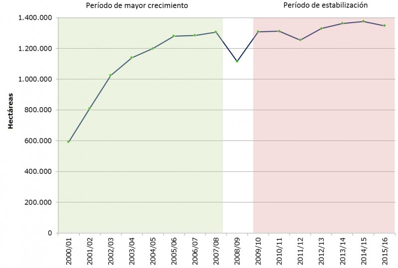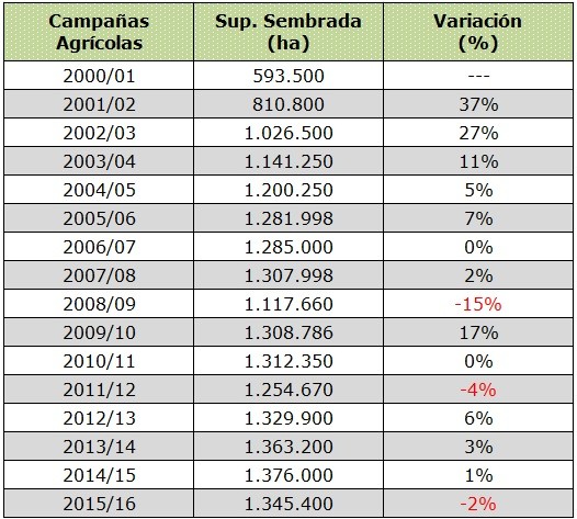 En los últimos 16 años la soja tuvo un crecimiento importante entre las campañas 2000/01 y 2007/08, posteriormente entre las campañas 2009/10 y 2015/16 el promedio del área cultivada se ubicó alrededor 1.330.000 ha (con la excepción de la sequía del ciclo 2008/09 que generó una caída en el área); pero si se restringe el análisis a las últimas 4 campañas se aprecia un promedio de aproximadamente 1.350.000 ha, ver Gráfico Nro. 1.