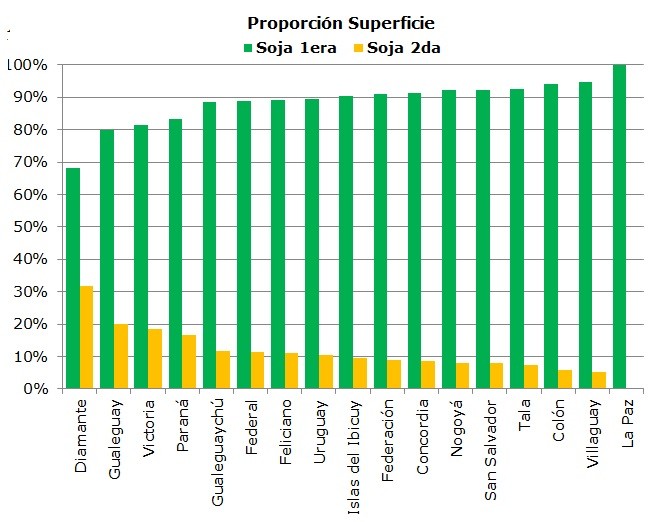 El departamento Diamante se posiciona con la mayor proporción cultivada con soja de 2da (32%); en segundo nivel de importancia se encuentran: Gualeguay, Victoria y Paraná que poseen un rango que oscila entre 20% al 17%, ver Gráfico Nro. 2.