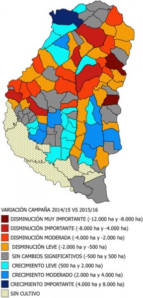 Por otra parte, en 26 distritos hubo un crecimiento del área, el crecimiento más significativo se detectó en Tacuaras (Dpto. La Paz).