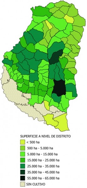 En estos 19 distritos abarcan un total de 605.000 ha, lo que equivale al 45% del área total implantada.