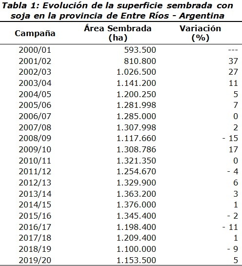 Los datos estadísticos sobre la evolución del área implantada con soja en Entre Ríos se presentan en la Tabla 1.