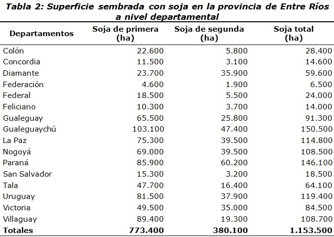 Los datos estadísticos sobre la superficie implantada con soja a nivel departamental se presentan en la Tabla 2.