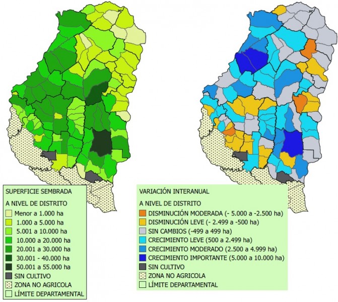 El distrito con mayor cantidad de hectáreas sembradas fue: Pehuajó al Norte (Dpto. Gualeguaychú) con una superficie que se ubicó dentro del rango de 50.001 a 55.000 ha.