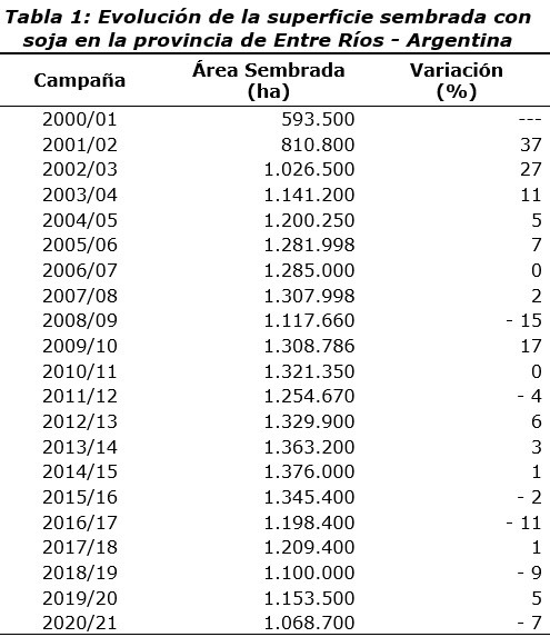 Los datos estadísticos sobre la evolución del área implantada con soja en Entre Ríos se presentan en la Tabla 1.