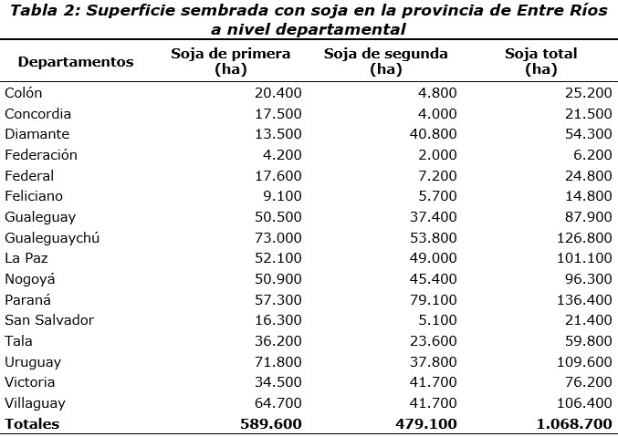 Los datos estadísticos sobre la superficie implantada con soja a nivel departamental se presentan en la Tabla 2.