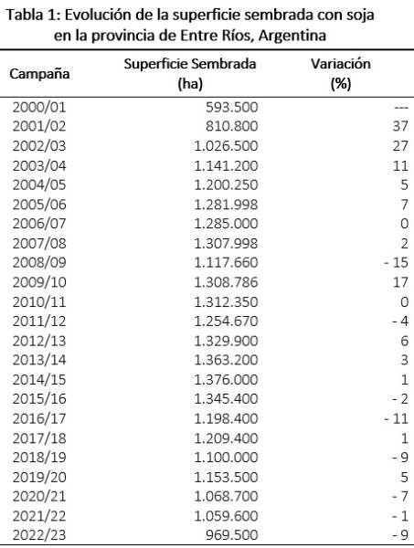 Los datos estadísticos sobre la evolución del área implantada con soja en Entre Ríos se presentan en la Tabla 1.