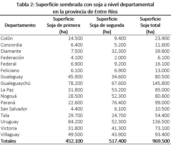 Los datos estadísticos sobre la superficie implantada con soja a nivel departamental se presentan en la Tabla 2.