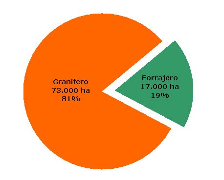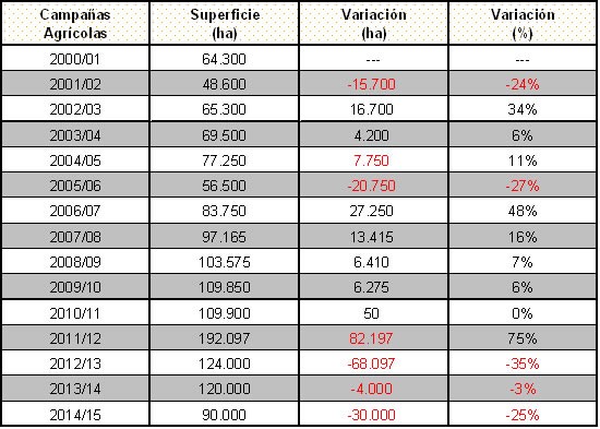 El área cultivada con el cereal experimentó una caída del 25%, lo que implica una reducción de 30.000 ha en relación al ciclo agrícola anterior, por lo tanto la superficie sembrada se ubicó en 90.000 ha.