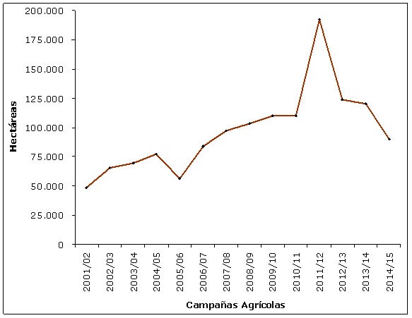 Por tercer año consecutivo se verificó una disminución en el área sembrada en Entre Ríos, luego de que alcanzara un pico máximo muy cercano a las 200.000 ha en la campaña 2011/12 considerando el período comprendido entre el ciclo 2001/02 y 2014/15, ver Gráfico Nro. 1.